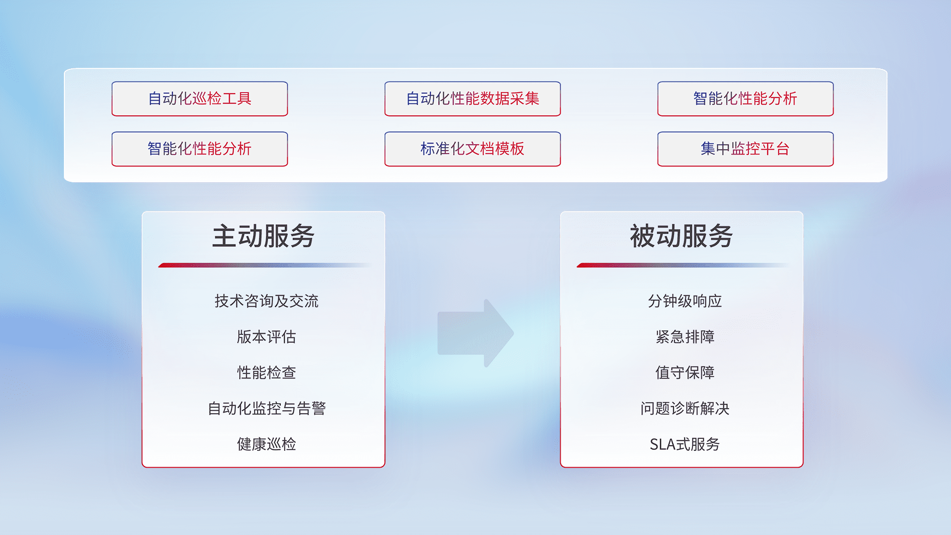 智能化工具和标准化文档,,,,保障服务质量,,,提供主动服务(包含技术咨询、、、、版本评估、、性能检查、、、自动化监控与告警、、、、健康巡检)和被动服务包含(分钟级响应、、紧急排障、、、值守保障、、、、问题诊断解决、、、SLA服务)。。。